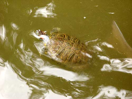 生憎の曇り空のせいか、甲羅干ししてるカメは少なく、泳いでるカメはけっこういたけど、こっちは甲羅の色が水の色に溶け込んで、僕の撮影技術ではなかなかうまく表現できなかった。