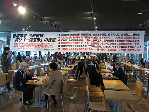 玄関をくぐった途端、『昔陸海軍 今財務省 再び「一億玉砕」の狂気』云々の巨大横断幕が目に飛び込んできて感動。