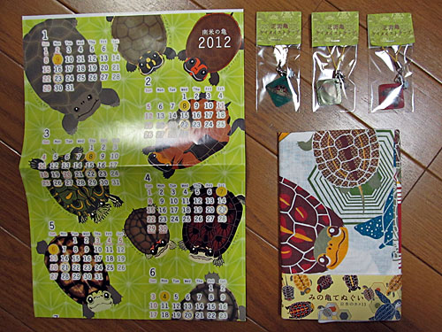 夜、友人とロシア料理を食べに行き、お祝いにカメの手ぬぐいとストラップとカレンダーをもらいました。
