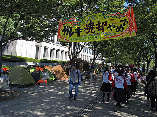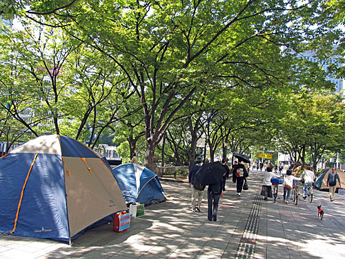 水曜に初めて訪ねたときには、確か8張りだった監視テントが、今朝来てみたら、いつの間にか11張りに増殖してました。
