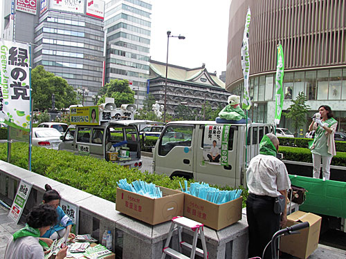 パレードが終わって、東京に帰るべく難波駅に急いだら、駅前で緑の党の長谷川ういこ候補が演説してました。
