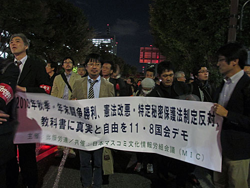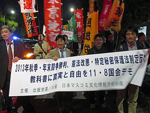 途中、出版労連主催「2013年秋季・年末闘争勝利、憲法改悪・特定秘密保護法制定反対、教科書に真実と自由を 11・8国会デモ」に遭遇、国会請願に同行しました。