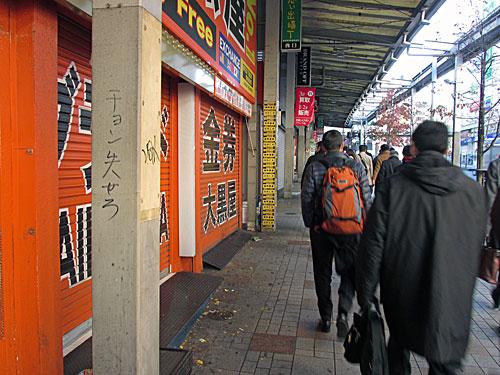 「新宿西口・大黒屋前の柱に書かれた『チョン失せろ』」