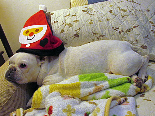 「原発イヤだ!電気は足りてるデモ!」(呼びかけ:原発イヤだ!府中)でサンタさんの帽子をもらったので、きんちゃんの頭にかぶせてみました。