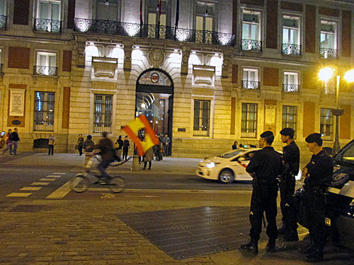 3枚目の男性は穴の開いたスペイン国旗を掲げて、マドリッド自治政府庁の前を何か叫びながら自転車で何度も往復してました。
