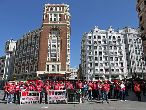 揃いの赤い服を人たちがコカ・コーラのボイコットを訴えてました。