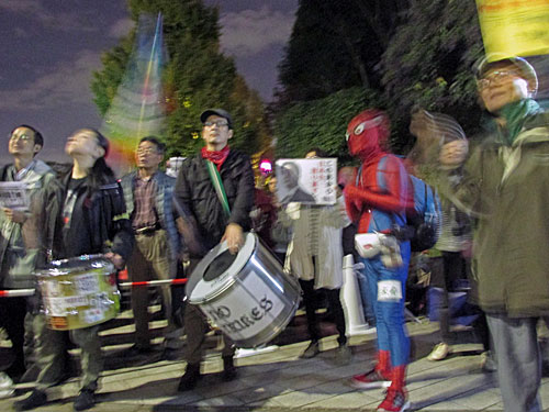 甲府から平和を訴え歩いてきたスパイダーマン、昨日、新宿で見つけられず、ようやく今夜、国会正門前で見つけて撮影に臨みましたが、結局、こんなぶれぶれの写真しか撮れませんでした。