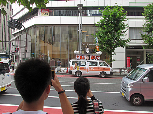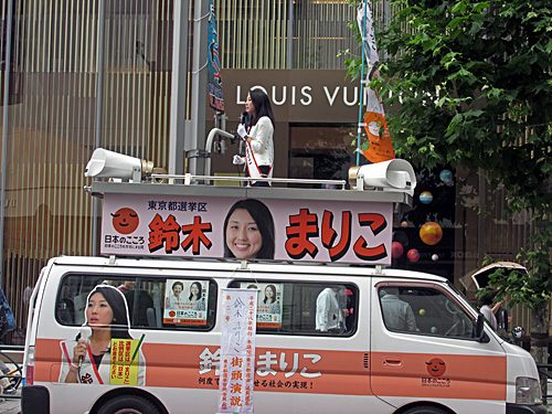 午後1時頃、新宿三丁目交差点で「日本のこころを大切にする党」の鈴木まりこ候補が街頭演説してました。