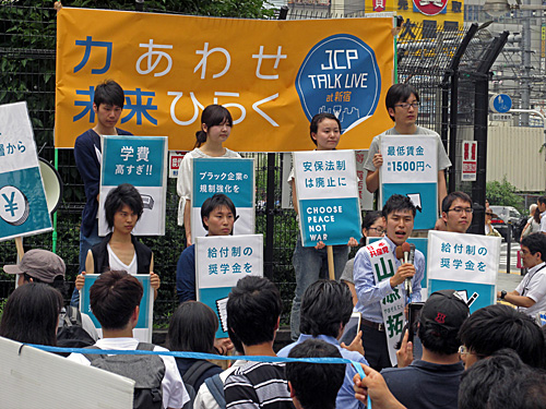 人が大勢集まってると思ったら、JCP TALK LIVEと書いてあって、間もなく日本共産党・山添拓候補の街頭演説が始まりました。