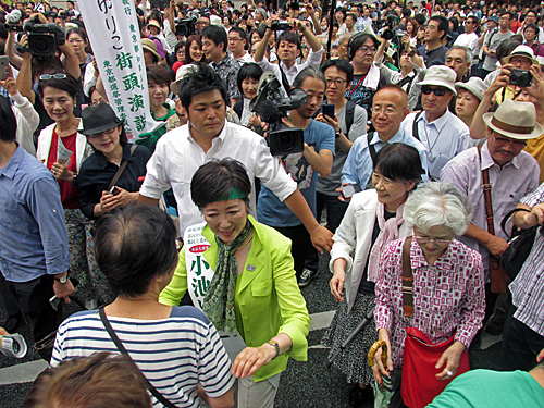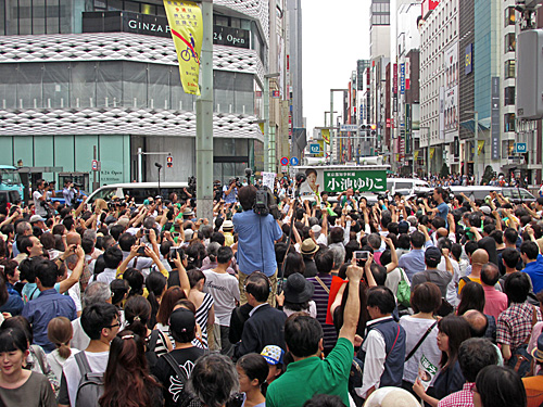 小池ゆりこ候補まだか?と思って待ってると、しばらくしてファンや野次馬やメディアに囲まれ、歩行者天国を練り歩きしてやって来ました。