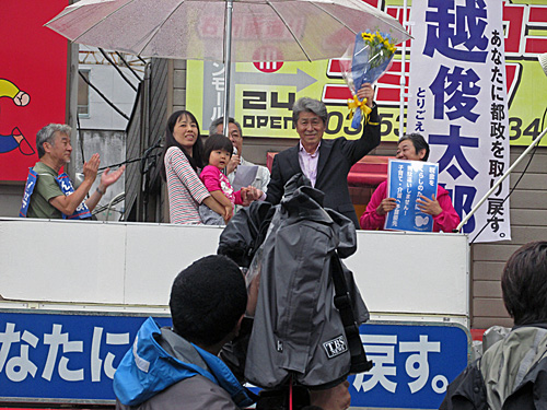 なんか知ってるような顔の親子が選挙カーの上に乗ってました。