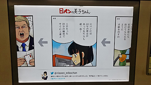 数日前、東京メトロ駅で、安倍首相とトランプ大統領が出てくる日ペンの美子ちゃんの広告を見て、興味をそそられ、いろいろと検索して、原画展に辿り着きました。