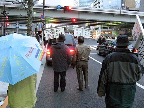 昨年の11月につづいてこれで2度目の参加。前回は10人くらい参加してたので、この日もそのつもりで行ったところ、当初、運転手の他に僕を含め3人しかおらず、40分以上、3人(+おまわりさん)だけで歩いた。後半、1人また1人と増え、靖国通りは5人デモに。うーん、渋すぎ(笑)。次回は3月かな。
