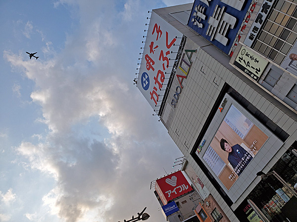 あれ、アルタの塔屋看板、いつの間にか「明太子かねふく」になってる、と思って、小池百合子都知事と1枚に収めるべく写真を撮ってたら、低空飛行の飛行機が。