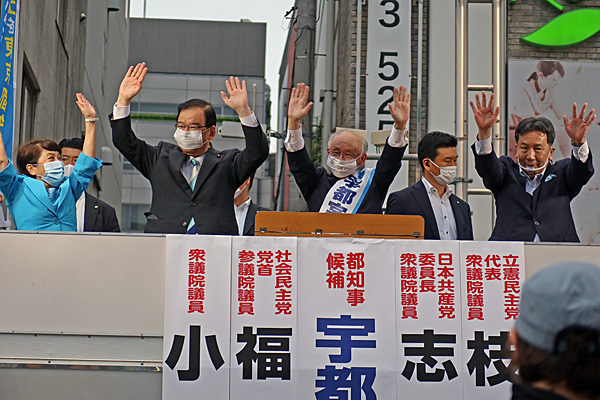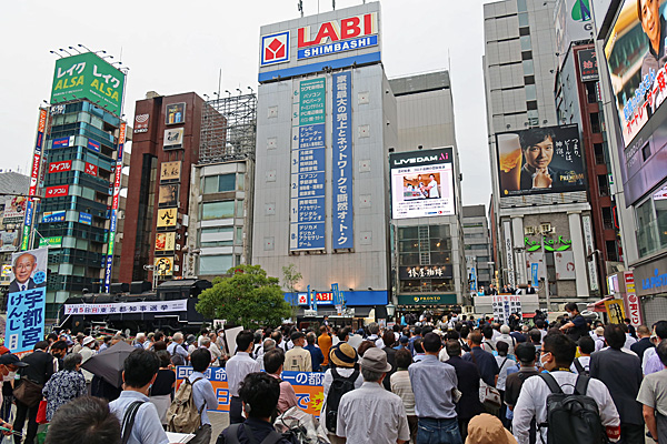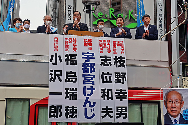 午後5時から6時頃、新橋駅前SL広場、宇都宮けんじ街頭宣伝です。