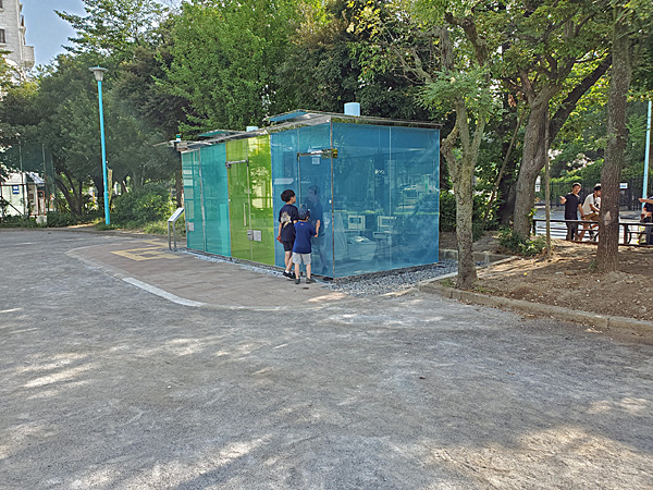 ふだんは透明で鍵をかけると不透明になるガラスの外壁のトイレが昨日(8月5日)稼働開始。