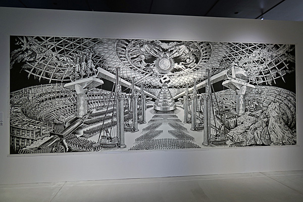 「ディスリンピック2680」は縦2.4m、横6.4mの巨大木版画で、2枚目の写真は作品中央の〈DYSLYMPOS〉の文字が読み取れる部分を切り取りました。