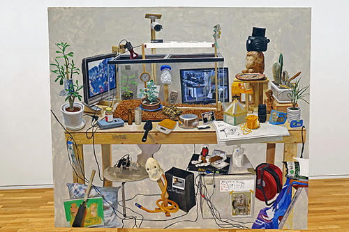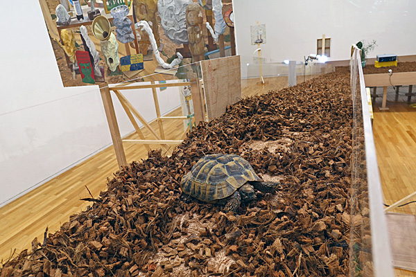 (2)紹介記事のタイトルに「会場を亀が歩く。」とありましたが、僕が行ったときは高いところで蹲ってました。脚立に乗って撮りました。水槽の中にもう1匹います。