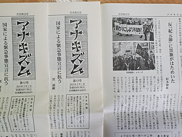 月刊情報紙「アナキズム」第12号(3月1日発行)が届いてました。