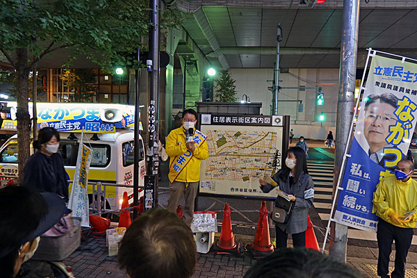 夕方、幡ヶ谷駅前でながつま昭候補(東京7区)が街頭演説してました。