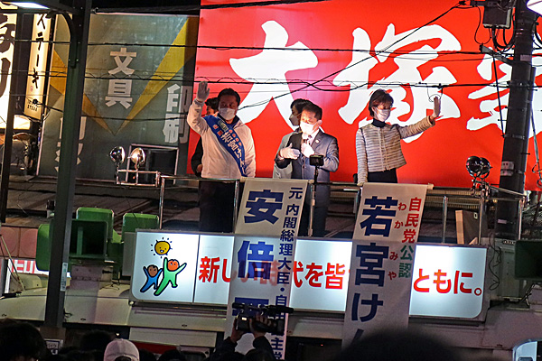 安倍の街頭演説が、5時に三軒茶屋キャロットタワー前、6時に中野駅前とあったので、いくらなんでも5時30分頃までには現れるだろうと思い、5時から自公議員のくそつまらない話を我慢して聴いてたのですが、5時55分になっても来やしません。