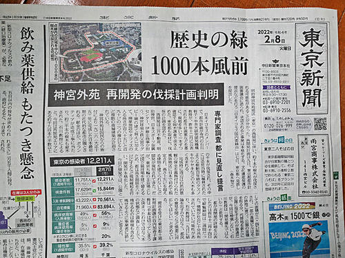 昨日の東京新聞1面に神宮外苑再開発の話が載ってました。
