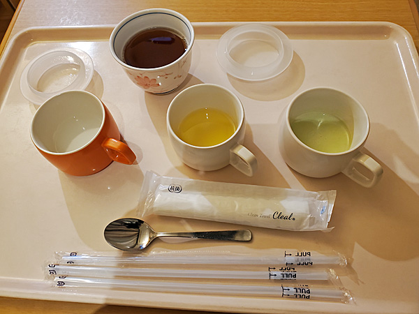 ランチは重湯とスープとデザート+お茶、ディナーは重湯とスープとジュース+お茶でしょうか。