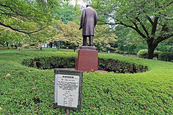 銅像裏の立て札の説明によると、吉田茂(1878年~1967年、日本武道館にて戦後唯一の国葬)の生誕百年記念事業として、1981年に建立されたとのこと。
