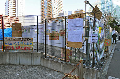 昨夕、Twitterで知ったのですが、昨昼の「渋谷区は美竹公園野宿者排除やめろデモ」の後、デモで使われた段ボールが美竹公園の仮囲いにぺたぺたと貼り出されたようでした。