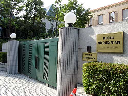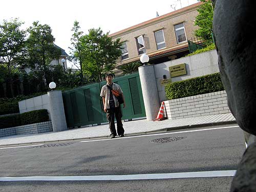 会長のダンボール人間も連れていきたかったのですが、大使館の警備がどの程度かわからず、不審人物扱いされて撮影できなくなると元も子もないし、それ以前に、自転車にダンボール人間と2人乗りするのは物理的にも困難が予想されたので、1人で表敬訪問してきました。