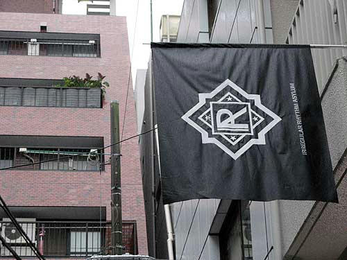先週末だったか、ショップの前を通ったときに、あれ、いつの間にかフラッグが新しくなってないか、と思って、そのときは夜だったし写真は撮らなかったんだけど、日曜日、「G8サミット直前東京行動 オルタナティブサウンドデモ」の後、「自由と生存のメーデー08」アフターイベントに向かう途中、また前を通って、なんとなく撮ったんだけど、いつの間にかまたなくなってた。
