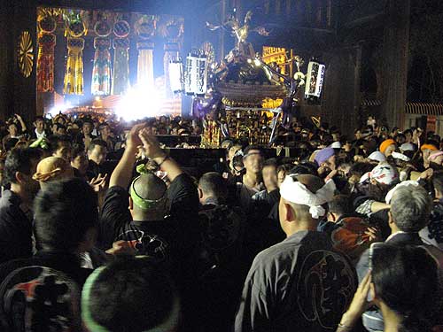 奉納芸能予定表に13日は「神輿振り」とあったので、「振り」の意味はよくわからないながら(神輿をぶるぶる振るわすのか、「男振り」とかいうときの「振り」なのか)、実は楽しみにしてたのですが、僕が着いたときには神輿は参道に鎮座してたので、すでに終わったのかと思ってたら、再び動き出したのでうれしくなりました。