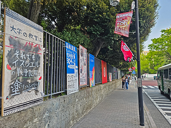 過日、何者か(シオニスト?)によって黒く塗り潰され、先日、修復された WASEDA WATERMELON ALLIANCE の日英2枚の立て看板を見に来ました。
