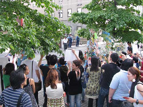 イスラエル軍に拘束された人々の解放を願い、七夕の夕べ、短冊を掲げた抗議集会を行います