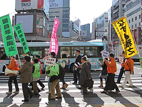 柏木公園を出発した時点では十数人しかいなくて、随分さびしいデモだなあ、と思ったのですが、大ガードをくぐった頃にはいつの間にか二十数人までふくらんでました。