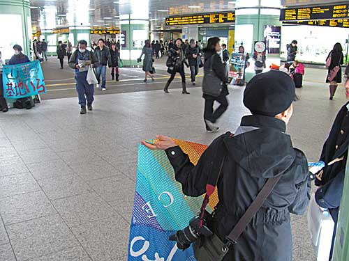 草の実アカデミーで小田マサノリさんが参加者に配ったポスターを持って立ちました。