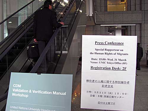 同日午後3時から国連広報センターで開かれたブスタマンテ氏による「移住者の人権に関する特別報告者記者会見」に向かうファルシャドさんです。