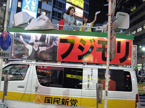 フジモリ選挙カー「デヴィ夫人も応援しています。」