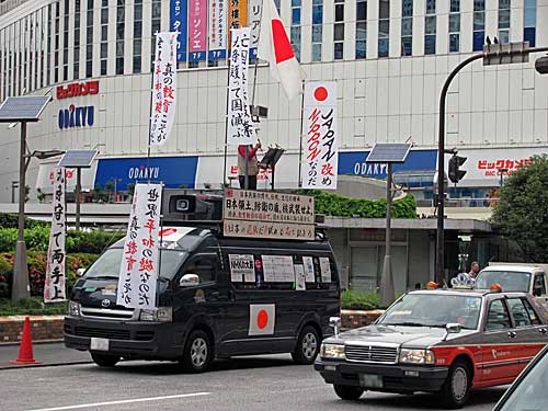 新宿西口でときどき見かける街宣車ですが、今日はちょっとそそられる幟旗を立ててたので、記念に写真撮ってきました。