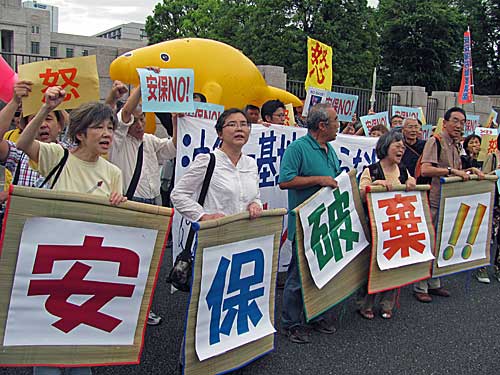 国会正門前で「安保NO!」「怒」等のプラカードをあげてアピール