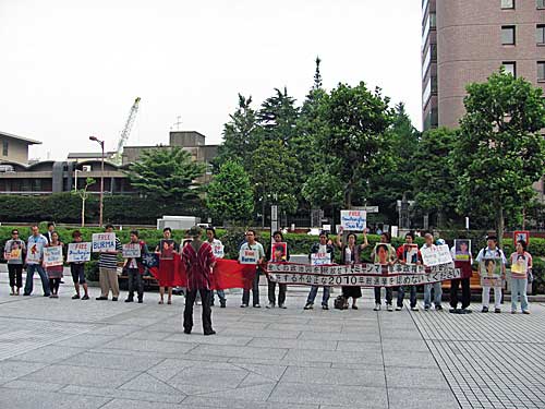 横断幕に「全ての政治囚を釈放せず、ミャンマー軍事政権が一方的に実施する不公正な2010年総選挙を認めないでください」と書いてあります。