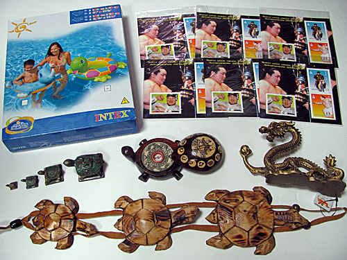 上段 左=カメの浮き輪 右=朝青龍の切手シート(6組)