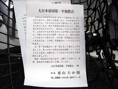 朝、歌舞伎町のエクセルシオール・カフェでチャバッタ・サンドとロイヤル・ミルクティーのモーニング・セットを食べて、出てきたら、停めてた自転車のカゴにこんなチラシが入ってた。