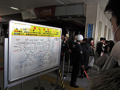 「14時50分頃、首都圏各線において 地震のため 赤線部は、運転をとりやめています。」