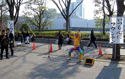 登天ポールさんの「いつも心にマウンテン~♪」のパフォーマンス、たまたま通りがかりに数分見ただけだったけど、あまりにインパクト強く、よく把握しないまま、先月号の「ルーフトップ」に原稿書いてしまったので、今日は後からでも一通りちゃんと見ておこうと、かつ掲載誌も届けようと、代々木公園まで自転車を転がして行ってきた。