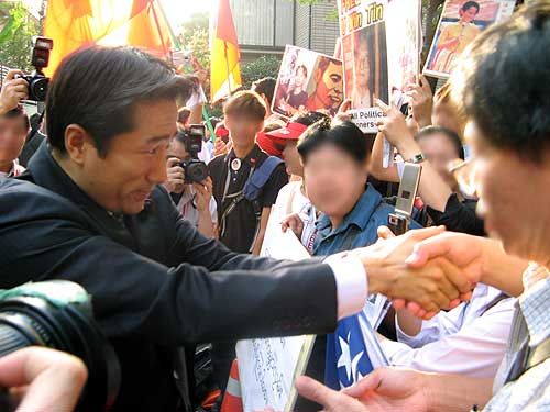 大使館へ申し入れをした後、ビルマ人1人ひとりにていねいに握手して激励の言葉をかけてました。