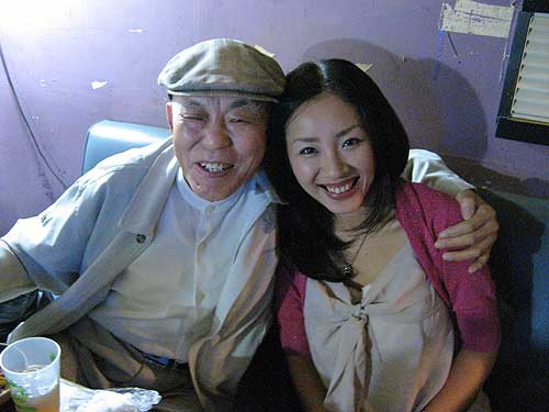 ↑ 主演女優の神楽坂恵さん(右)と護國團の石井一昌さん(左)