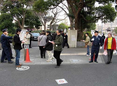 東京都慰霊堂のある横網町公園入り口で、慰霊祭に来る人、帰る人たちに