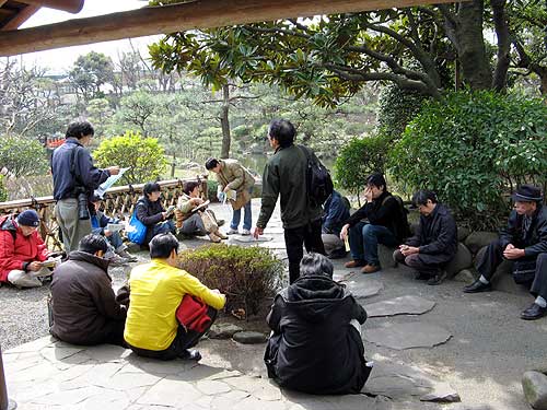 情宣行動終了後、近くの旧安田庭園で集約集会。