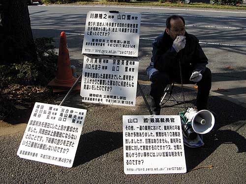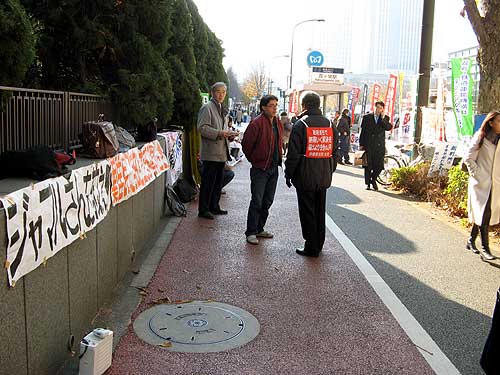 「レイバーフェスタ2007」の3分ビデオで僕が一番面白いと思った「裁判所前の男」の主役のおじさん、今日も裁判所前に坐ってました。